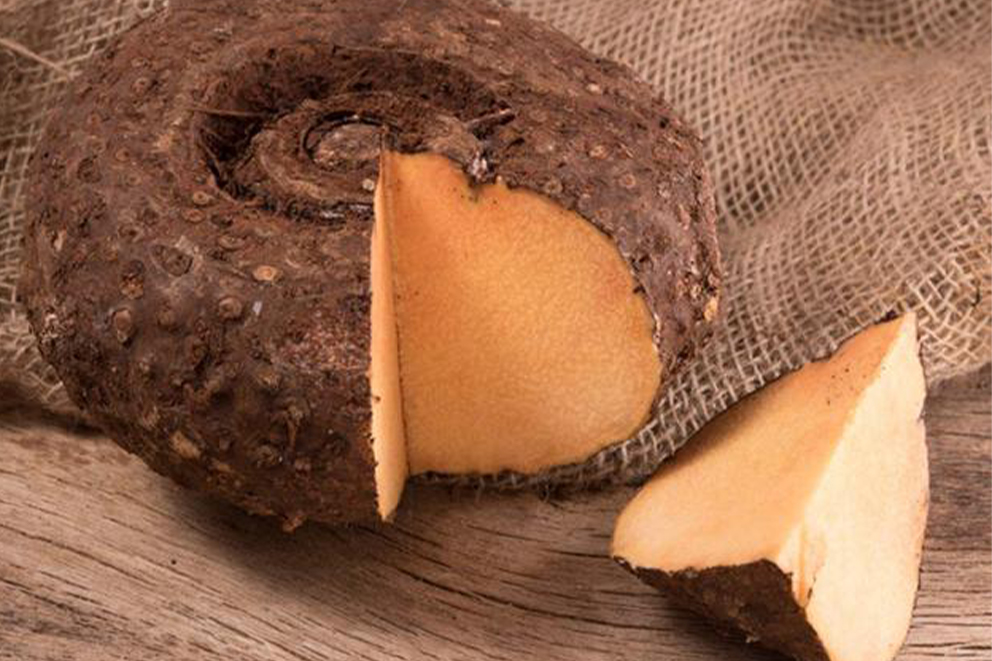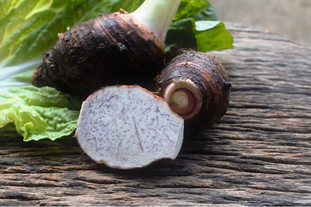 Taro also called eddo or dasheen is a starchy root vegetable. It has complex carbohydrates, fiber, potassium, vitamin B6, and manganese. It promotes good gut health.